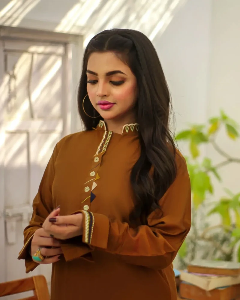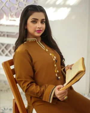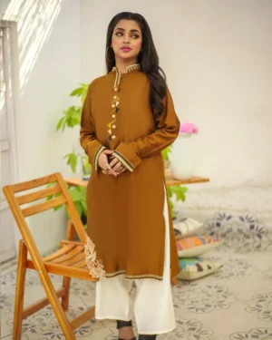 “Elegance redefined, this stunning 2-piece suit combines timeless charm with contemporary sophistication. Crafted from rich brown fabric and paired with crisp white trousers, this ensemble is adorned with intricate machine embroidery that adds a touch of refined artistry. The flowing kurta is designed to drape beautifully, highlighting its delicate patterns and attention to detail. The warm brown hue paired with the classic white creates a harmonious contrast, making this suit a perfect choice for formal gatherings and special occasions. Step out in style and confidence with this exquisite creation that exudes grace and allure.”