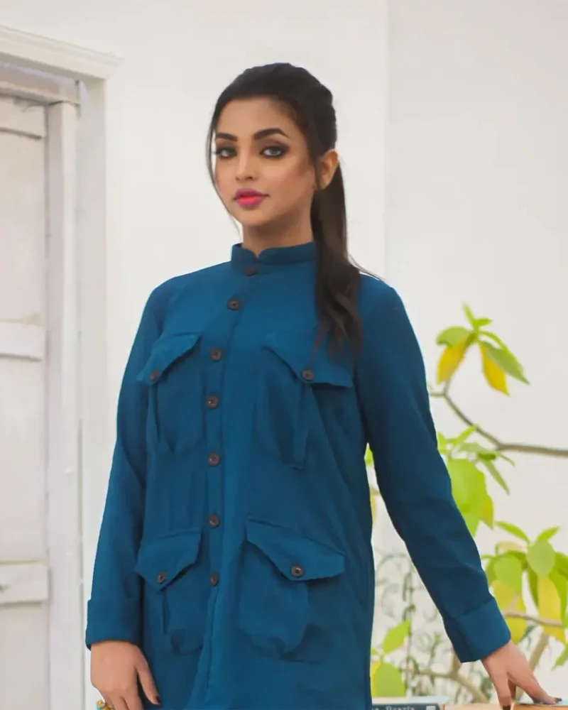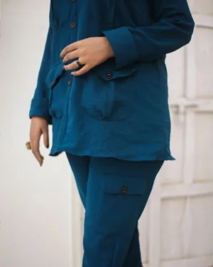 Elegance redefined, this stunning petroleum blue two-piece cord set is a seamless fusion of contemporary charm and timeless sophistication. Crafted from premium fabric, the safari-style suit features a tailored jacket with refined details and matching straight-cut trousers. The rich petroleum blue hue adds depth and character, while the sleek design ensures both comfort and style. Perfect for formal gatherings and standout occasions, this ensemble is a statement of modern grace that will make you feel effortlessly chic.”