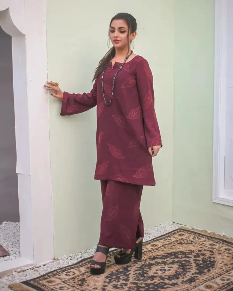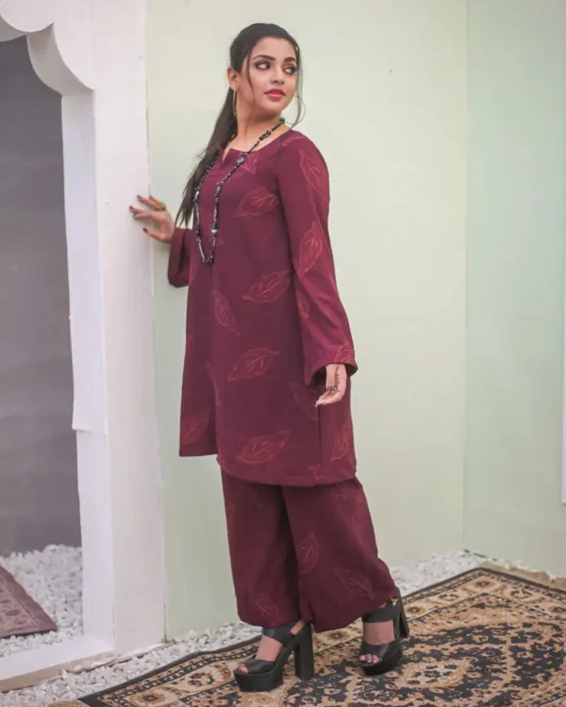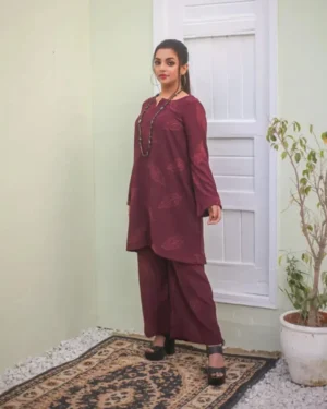 “Elegance redefined, this striking maroon 2-piece cord set seamlessly combines contemporary charm with timeless appeal. Crafted from premium fabric, the set features an eye-catching printed design that adds a touch of bold sophistication. The ensemble includes a tailored top with a relaxed yet flattering fit and matching trousers, offering both comfort and style. The rich maroon hue radiates confidence and grace, making it an ideal choice for casual gatherings, festive occasions, or a chic day out. This standout outfit is designed to make you feel effortlessly stylish and undeniably unique.”